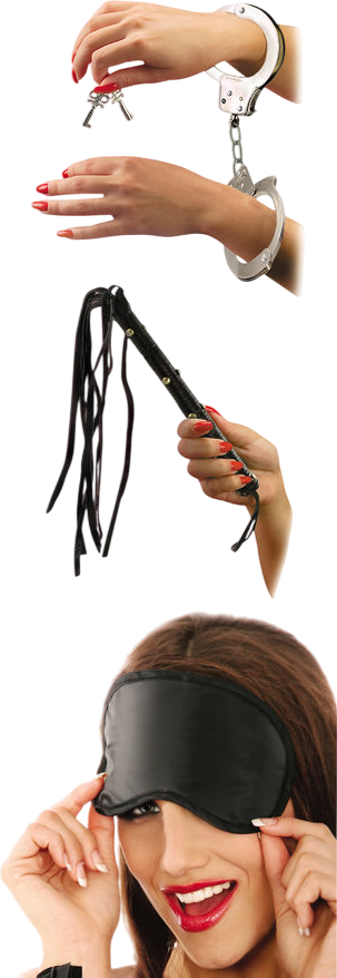 Ένα ζευγάρι μεταλλικές χειροπέδες, ένα δερμάτινο μαστίγιο με πολλές ουρίτσες και μια σατέν μάσκα για τα μάτια.