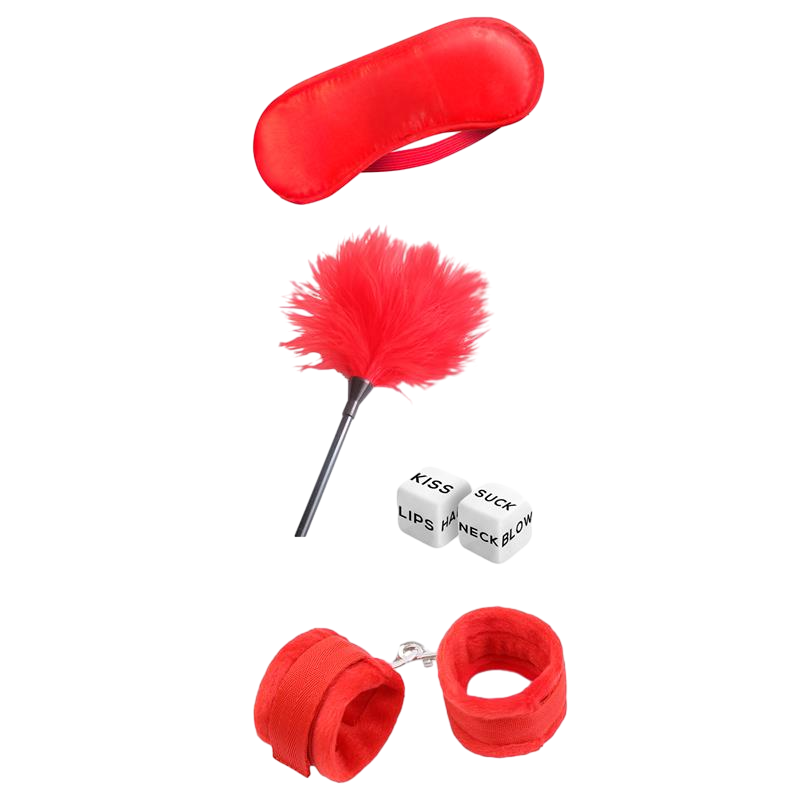 Το σετ περιλαμβάνει μία κόκκινη σατέν μάσκα ματιών, χειροπέδες με κλείσιμο velcro για σταθερό αλλά άνετο κράτημα, ένα φτερό για ελαφριές επαφές στο σώμα και ένα ζευγάρι ζάρια με εντολές για δράση και μέρη του σώματος. Τα υλικά είναι απαλά στο δέρμα και εύκολα στη χρήση, κάνοντας το σετ ιδανικό για αρχάριες που θέλουν να πειραματιστούν με νέα ερεθίσματα χωρίς πίεση.