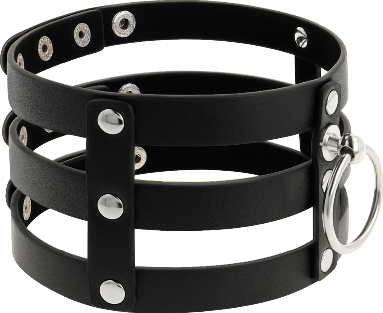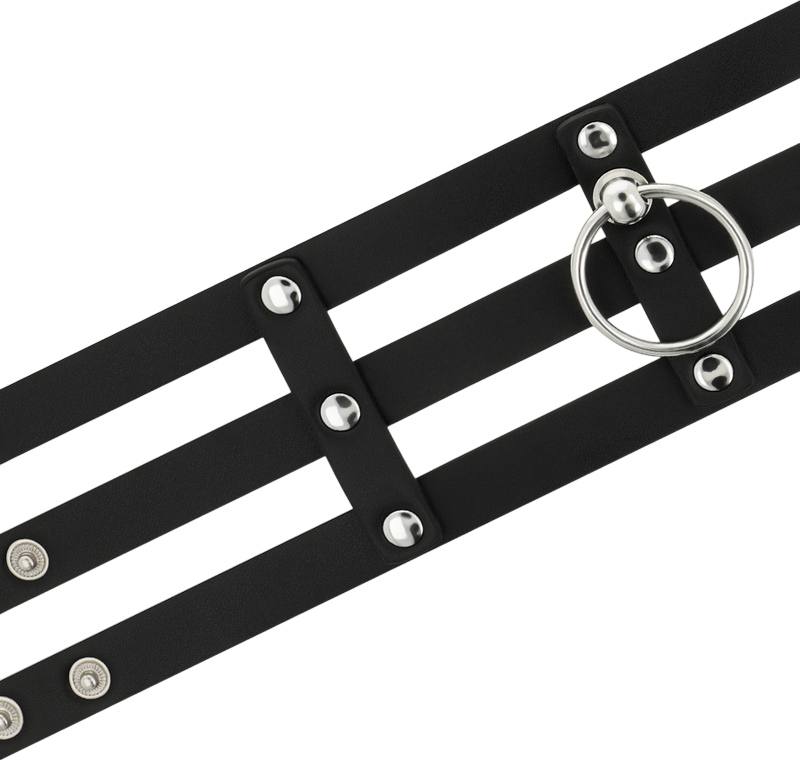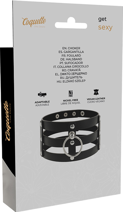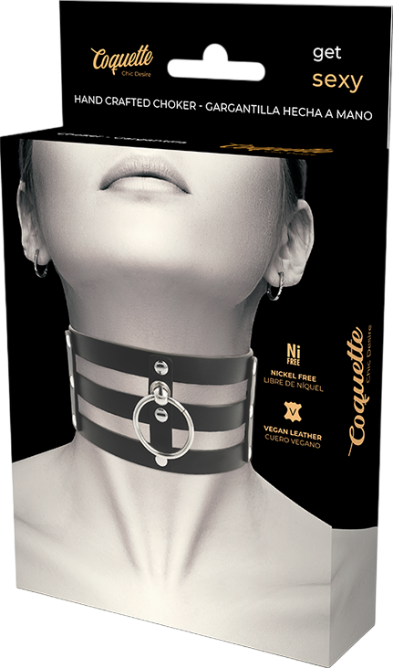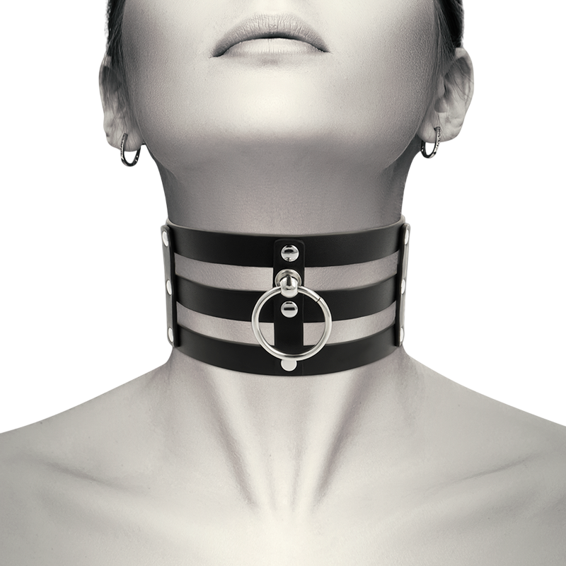 Ο τριπλός ιμάντας και ο μεγάλος μεταλλικός κρίκος στην μπροστινή πλευρά κάνουν αυτό το περιλαίμιο της Coquette ιδιαίτερα ξεχωριστό. Έντονο BDSM στοιχείο, βαθύ μαύρο χρώμα και αυστηρός σχεδιασμός είναι τα κύρια χαρακτηριστικά του γνωρίσματα.