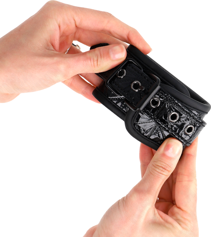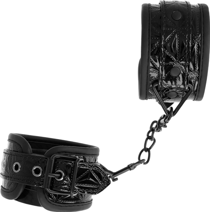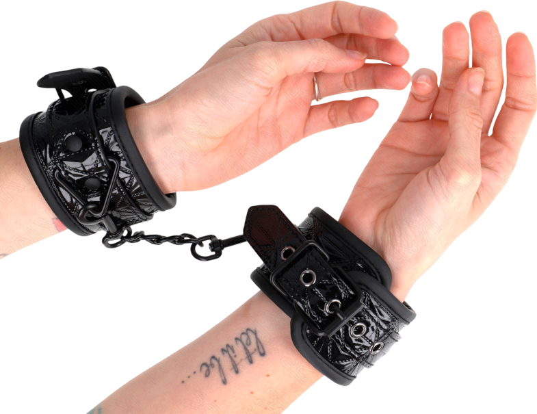 Κατασκευασμένα από υψηλής ποιότητας δερματίνη, αγκαλιάζουν τους καρπούς με άνεση και σταθερότητα, χωρίς να προκαλούν δυσφορία. Η ρυθμιζόμενη εφαρμογή τους επιτρέπει απόλυτο έλεγχο, ενώ οι μεταλλικοί κρίκοι προσφέρουν εύκολη σύνδεση με αλυσίδες ή άλλα bondage αξεσουάρ. Ο κομψός μαύρος σχεδιασμός τους ταιριάζει σε κάθε BDSM συλλογή, προσθέτοντας ένα άγγιγμα πολυτέλειας σε κάθε παιχνίδι