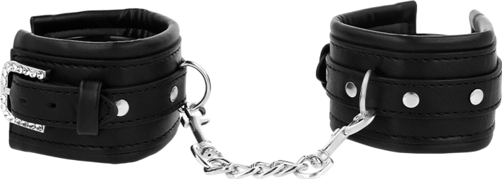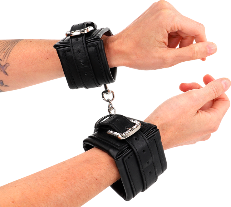 Κατασκευασμένα από υψηλής ποιότητας δερματίνη, αυτά τα δεσμά προσφέρουν ανθεκτικότητα και άνεση, ακόμα και για πολύωρη χρήση. Η ρυθμιζόμενη εφαρμογή τους εξασφαλίζει τέλειο κράτημα, ενώ οι μεταλλικοί κρίκοι επιτρέπουν εύκολη σύνδεση με αλυσίδες ή άλλα bondage αξεσουάρ. Ο μαύρος σχεδιασμός τους, σε συνδυασμό με τις λαμπερές λεπτομέρειες, προσθέτει έναν αέρα αισθησιασμού και πολυτέλειας