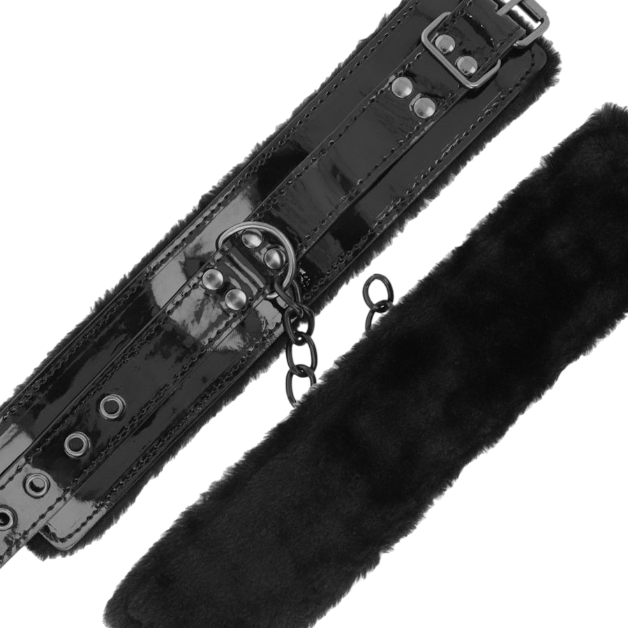 Κατασκευάζονται από ποιοτικό δέρμα PVC και διαθέτουν εσωτερική επιφάνεια από γούνα, ενώ οι μεταλλικές αγκράφες και οι πόρπες τις καθιστούν απόλυτα ρυθμιζόμενες και ανθεκτικές. Κλειδώνουν μεταξύ τους με λουκέτο που εξασφαλίζει ότι ο υποτακτικός σας θα παραμείνει δεμένος για όσο θελήσετε εσείς.