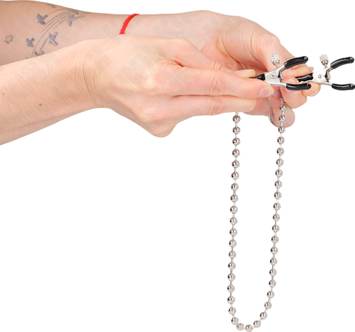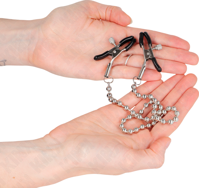 Αν θες να δώσεις στις θηλές σου τον ρόλο του πρωταγωνιστή, οι σφιγκτήρες Kink Bead Chain Nipple Clamps είναι η ιδανική πρόσκληση για ένα ταξίδι στην απόλαυση και τον πόνο. Οι ρυθμιζόμενοι σφιγκτήρες εφαρμόζουν σταθερά και με ακρίβεια πάνω στις θηλές σου, ενώ η ενδιάμεση μεταλλική αλυσίδα – διακοσμημένη με γυαλιστερές μπίλιες – τις ενώνει με τρόπο τόσο αισθησιακό, όσο και προκλητικό.