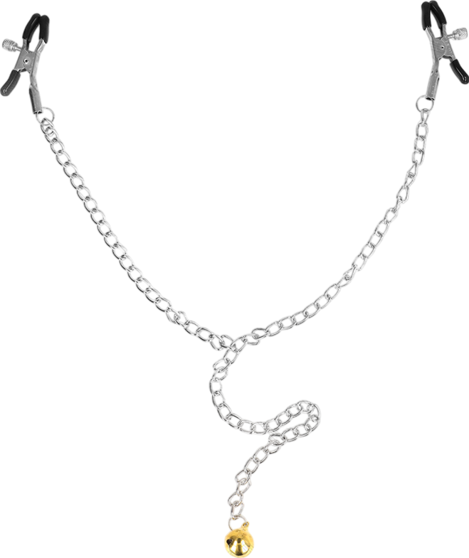 Κάθε του τράνταγμα, κάθε σου αναστεναγμός, συνοδεύεται από τον μεταλλικό του ψίθυρο. Το βάρος της αλυσίδας γλιστρά πάνω στο δέρμα και προκαλεί ένα κύμα διέγερσης που ταξιδεύει από τις θηλές μέχρι κάθε σου αισθητήριο. Οι σφιγκτήρες είναι ρυθμιζόμενοι, ώστε να επιλέγεις εσύ την ένταση της απόλαυσης, και το κουδουνάκι λειτουργεί σαν το μικρό, ατίθασο μυστικό σου.