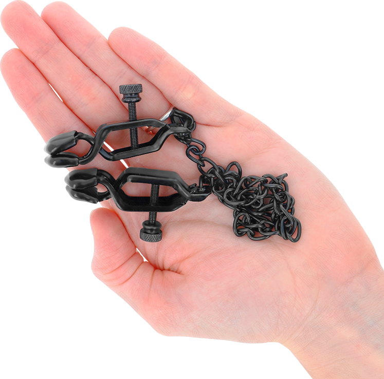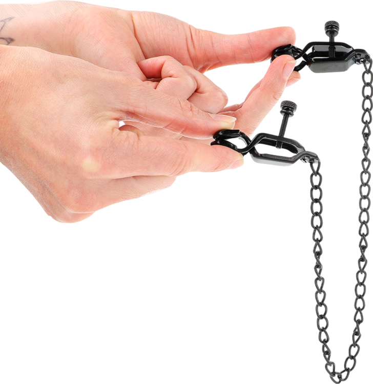 Οι σφιγκτήρες είναι ρυθμιζόμενοι ώστε να ταιριάζουν σε κάθε επίπεδο εμπειρίας – από την πρώτη δόνηση της περιέργειας, μέχρι τη φωτιά της απόλυτης κυριαρχίας. Η αλυσίδα όχι μόνο προσθέτει οπτική ένταση, αλλά επιτρέπει και δυναμικό χειρισμό... είτε πρόκειται για απαλά τσιμπήματα είτε για προκλήσεις που ανεβάζουν τη θερμοκρασία στα κόκκινα.