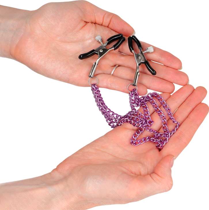 Το μεταλλικό σώμα των σφιγκτήρων είναι ρυθμιζόμενο, επιτρέποντάς σου να παίξεις με την πίεση ακριβώς όπως σου αρέσει. Οι τρεις αλυσίδες δεν είναι απλώς διακοσμητικές· λειτουργούν σαν αισθησιακή γέφυρα που ενώνει τον πόθο με την απόλαυση. Το βαθύ μοβ χρώμα τους φέρνει μια πολυτελή αισθητική που ξεχωρίζει.