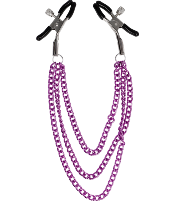 Το μεταλλικό σώμα των σφιγκτήρων είναι ρυθμιζόμενο, επιτρέποντάς σου να παίξεις με την πίεση ακριβώς όπως σου αρέσει. Οι τρεις αλυσίδες δεν είναι απλώς διακοσμητικές· λειτουργούν σαν αισθησιακή γέφυρα που ενώνει τον πόθο με την απόλαυση. Το βαθύ μοβ χρώμα τους φέρνει μια πολυτελή αισθητική που ξεχωρίζει.