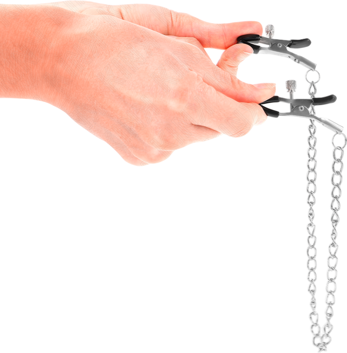 Οι σφιγκτήρες προσαρμόζονται εύκολα, ώστε να πετύχεις την ιδανική πίεση: απαλή, για να ξεκινήσεις απαλά το teasing, ή πιο σκληρή για πιο έντονες απολαύσεις. Η λεπτή αλυσίδα προσθέτει μια διακριτική αλλά απολύτως αισθητή δόνηση σε κάθε κίνηση. Καθώς το σώμα σου αντιδρά, το βάρος και η τριβή της αλυσίδας εντείνουν την ηδονή με κάθε αναπνοή.