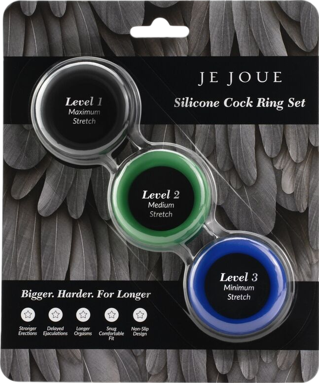 Το σετ δαχτυλιδιών σιλικόνης της Je Joue αποτελείται από 3 υψηλής ποιότητας δαχτυλίδια σιλικόνης που είναι προοδευτικά πιο σφιχτά, επιτρέποντάς σας να πειραματιστείτε με διαφορετικές αισθήσεις και συνδυασμούς, Κάθε δαχτυλίδι έχει μια μαλακή , μεταξένια υφή που εξασφαλίζει μέγιστη άνεση και μπορεί να φορεθεί γύρω από το πέος, τους όρχεις ή και τα δύο!