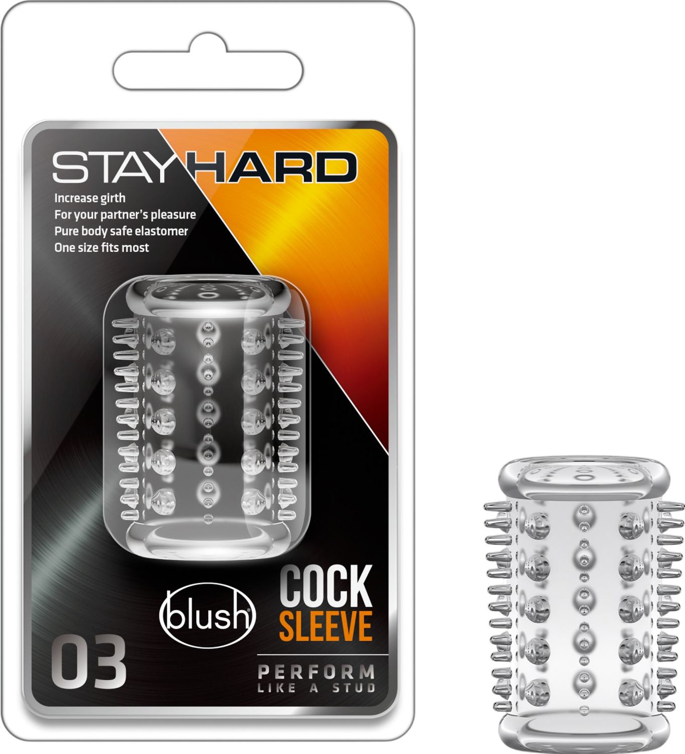 Το Stay Hard Cock Sleeve 03 είναι κατασκευασμένο από ποιοτικό TPE και φέρει στην επιφάνεια του ένα συνδυασμό από ακίδες & εξογκώματα ικανό να της προκαλέσουν απίστευτη διέγερση. Είναι εξαιρετικά ελαστικό και μπορεί να εφαρμόσει τέλεια σε κάθε μέγεθος πέους χωρίς να ενοχλεί. Επιπλέον μπορείτε να το χρησιμοποιήσετε με την ίδια επιτυχία στον αγαπημένο σας δονητή και να απολαύσετε μαζί του ένα άκρως αισθησιακό solo παιχνίδι.