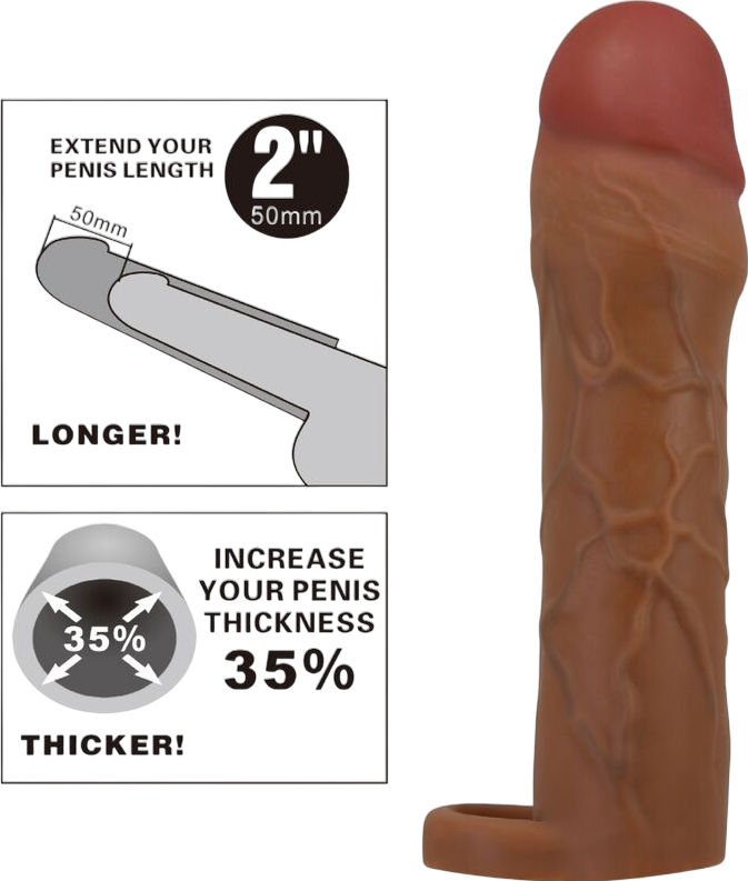 Φτιαγμένη από εξαιρετικά ρεαλιστικό υλικό, αυτή η προέκταση μιμείται την αίσθηση του αληθινού δέρματος, ενώ η ανάγλυφη επιφάνειά της με τις φλέβες προσφέρει έντονη διέγερση. Το εσωτερικό της είναι απαλό και αγκαλιάζει το πέος για ασφαλή εφαρμογή και μέγιστη άνεση κατά τη διάρκεια της δράσης.
