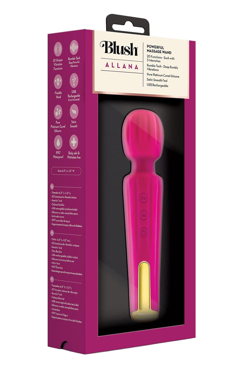 Ο Blush Allana είναι ένας πανίσχυρος δονητής σε σχήμα wand με εύκαμπτη κεφαλή, σχεδιασμένος για να προσφέρει στιγμές απόλυτης χαλάρωσης και απόλαυσης. Με τον προηγμένο κινητήρα RumboTech, αυτή η συσκευή προσφέρει βαθιές και γεμάτες δονήσεις που εστιάζουν ακριβώς στα σημεία που επιθυμείτε. Είναι η ιδανική επιλογή για όσες αναζητούν ένα αξεσουάρ που συνδυάζει την πολυτελή αίσθηση με την έντονη απόδοση.
