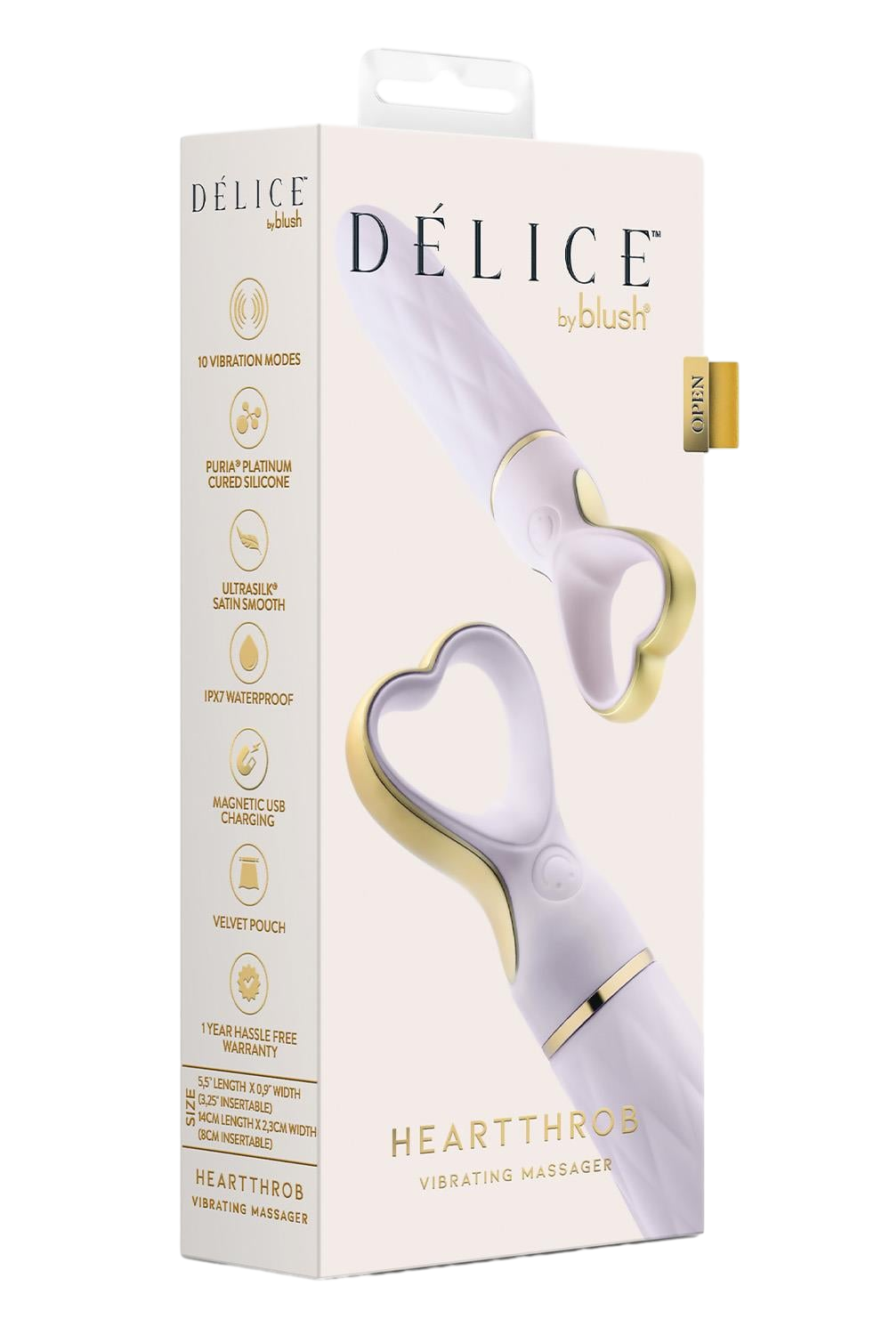 Είναι κατασκευασμένος από κορυφαίας ποιότητας σιλικόνη Puria με το χαρακτηριστικό φινίρισμα UltraSilk, προσφέροντας μια ακαταμάχητα απαλή και μεταξένια αίσθηση στο δέρμα. Η λαβή σε σχήμα καρδιάς με τις χρυσές λεπτομέρειες προσθέτει μια νότα κομψότητας, κάνοντας τη χρήση του ακόμα πιο ευχάριστη. Διαθέτει 5 ταχύτητες και 5 μοτίβα δόνησης, δίνοντάς σας τη δυνατότητα να προσαρμόσετε την ένταση ακριβώς εκεί που επιθυμείτε με το πάτημα ενός κουμπιού.