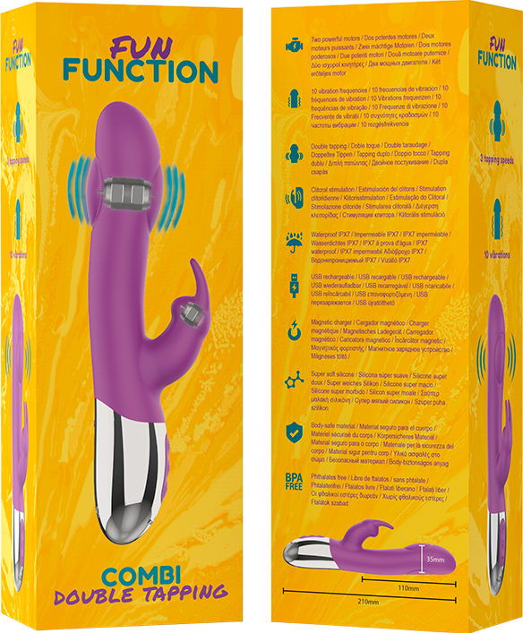 Ο rabbit δονητής COMBI DOUBLE TAPPING της FUN FUNCTION διαθέτει εξαιρετικά ισχυρή δόνηση χάρη στα δύο μοτέρ του που είναι τοποθετημένα, το ένα στην άκρη του δονητή και το άλλο στο κλειτοριδικό στέλεχος. Διαθέτει 10 προγράμματα δόνησης και μπορεί να διεγείρει ταυτόχρονα σημείο G και κλειτορίδα χαρίζοντας σας ατελείωτη απόλαυση.