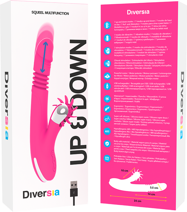 Η σειρά DIVERSIA BUNNY UP & DOWN ενσωματώνει τη λειτουργία "πάνω και κάτω" με μοναδικό τρόπο. Πατήστε το κουμπί ON και δεν θα μπορείτε να σταματήσετε, ενεργοποιήστε τη δόνηση και θα νιώσετε 100% τη δύναμη αυτού του sex toy.