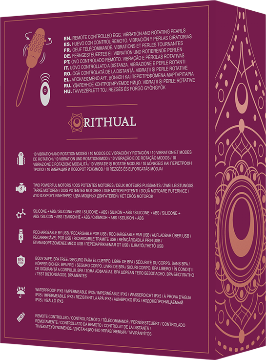 Υπέροχος μπορντό χρωματισμός σε συνδυασμό με χρυσές λεπτομέρειες - μοναδικός σχεδιασμός που δίνει υψηλή αισθητική στις προσωπικές σας στιγμές. Το τηλεχειριζόμενο ερωτικό αυγό Sita από την Ritual σας δίνει τη δυνατότητα να το λειτουργήσετε από απόσταση μέσω τηλεχειριζόμενου χειριστηρίου επιλέγοντας το επιθυμητό πρόγραμμα δόνησης με το πάτημα ενός κουμπιού!