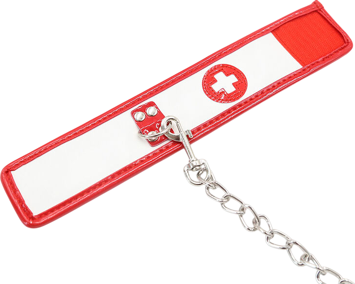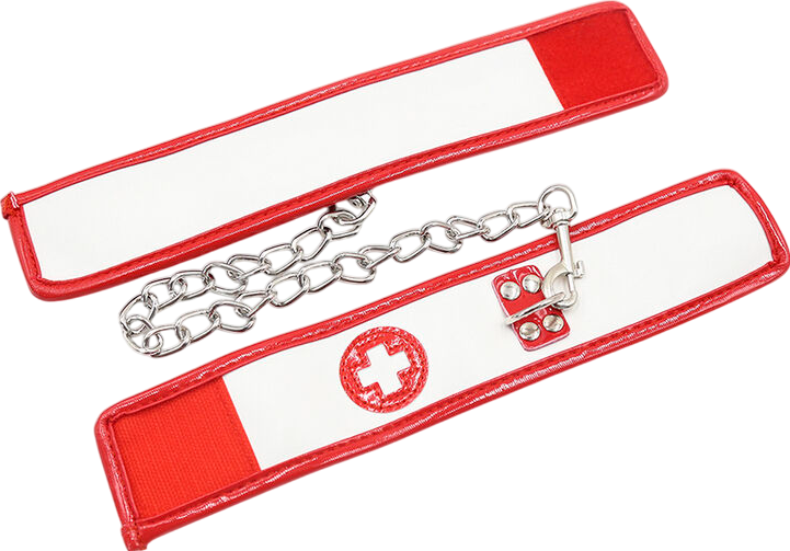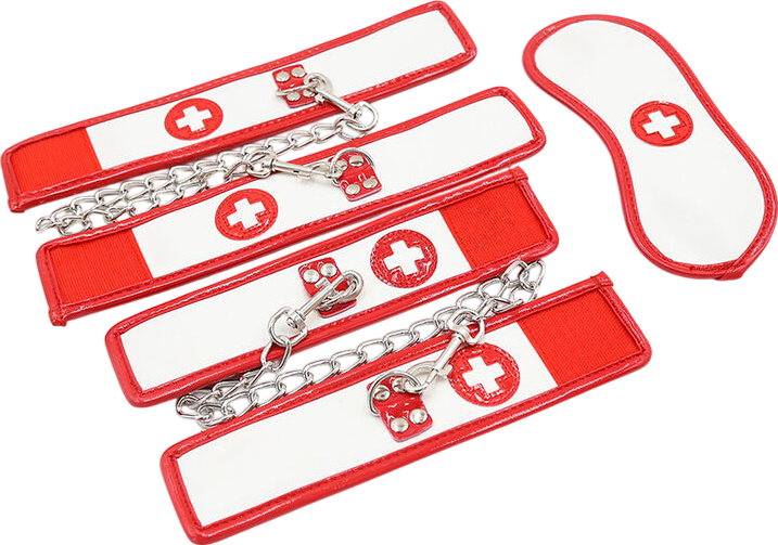 Το σετ αποτελείται από χειροπέδες, ποδοπέδες και μάσκα, όλα σε στυλ νοσοκόμας και αποτελεί τέλεια επιλογή για συνδυασμό με μια στολή ρόλων στο ίδιο ύφος.