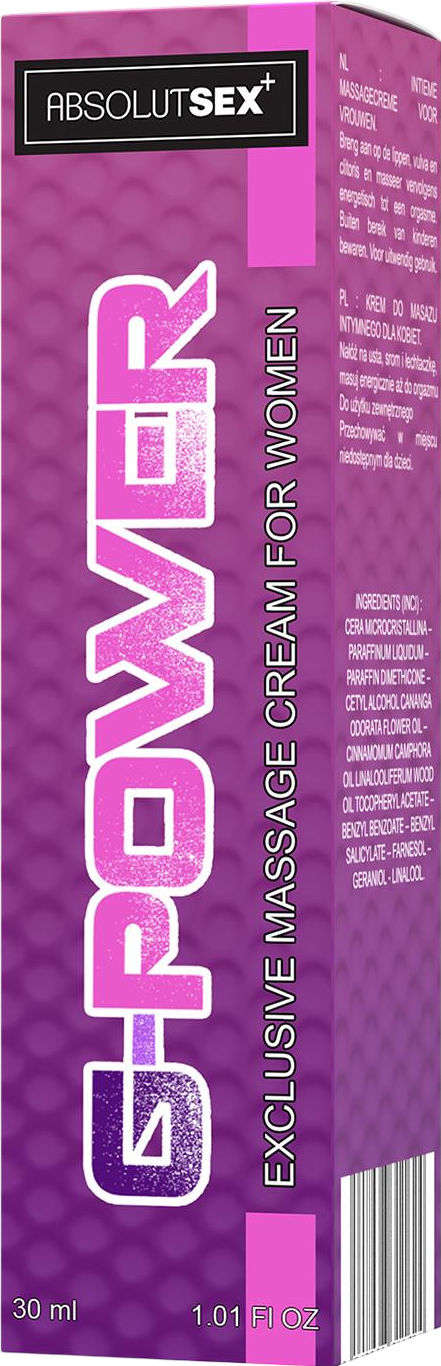 Έτοιμη να απογειώσεις την απόλαυσή σου; Το G Power είναι η απόλυτη κρέμα διέγερσης για γυναίκες, σχεδιασμένη για να ενισχύσει την ευχαρίστηση και να παρατείνει την ηδονή! Φτιαγμένη στη Γαλλία από την AbsolutSex, αυτή η κρέμα περιέχει εκχυλίσματα ylang ylang και βιταμίνη Ε, προσφέροντάς σου αυξημένη αίσθηση και ένταση κατά τη διάρκεια των πιο προσωπικών σου στιγμών.
