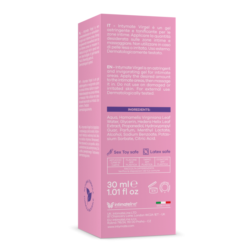 Το Intymate Virgel είναι ένα γυναικείο τονωτικό τζελ με βάση το νερό για την ευαίσθητη περιοχή. Χάρη στις τονοτικές του ιδιότητες, αυτό το τζελ βοηθά στην φροντίδα των κολπικών τοιχωμάτων, δίνοντάς τους σφριγηλότητα. Χάρη στην απόλυτα φυσική του σύνθεση, είναι ένα τζελ κατάλληλο για όλους και ασφαλές για τον οργανισμό.