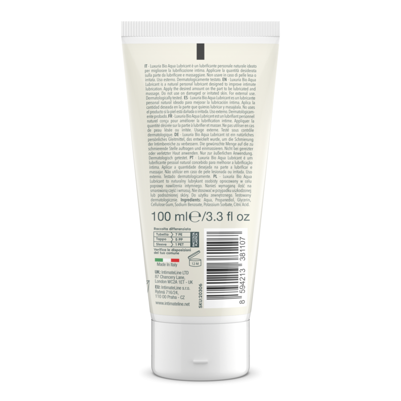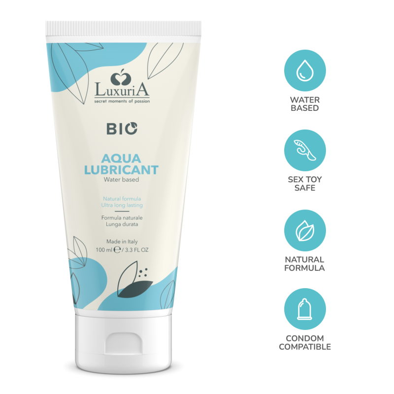 Το Luxuria BIO Aqua Lubricant είναι ένα εντελώς οικολογικό λιπαντικό τζελ με βάση το νερό που χρησιμοποιεί φυσικά εκχυλίσματα για να παρέχει στην ευαίσθητη περιοχή βαθιά ενυδάτωση για μεγαλύτερες χρονικές περιόδους.