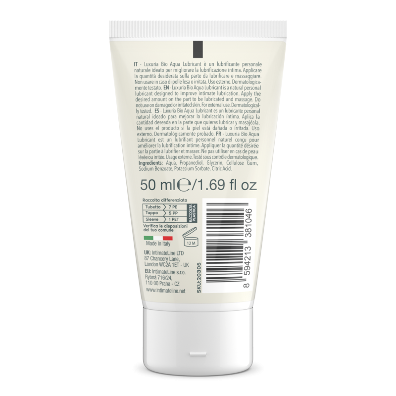 Το Luxuria BIO Aqua Lubricant είναι ένα εντελώς οικολογικό λιπαντικό τζελ με βάση το νερό που χρησιμοποιεί φυσικά εκχυλίσματα για να παρέχει στην ευαίσθητη περιοχή βαθιά ενυδάτωση για μεγαλύτερες χρονικές περιόδους.